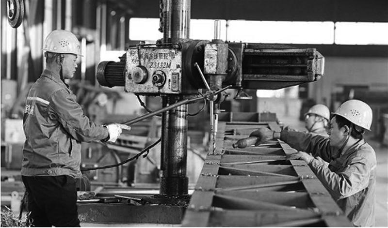 位于渭南高新区的陕西中路西建(集团)公司是集研发、制造、销售、服务于一体的建筑机械设备集团化企业。今年以来,中路西建(集团)公司逆势上扬,发货额1.3亿元,签单额3.7亿元,同比增长28.7%,利润同比增长35.2%。图为工人在铆焊车间给上料皮带机钻孔。肖晓良 摄