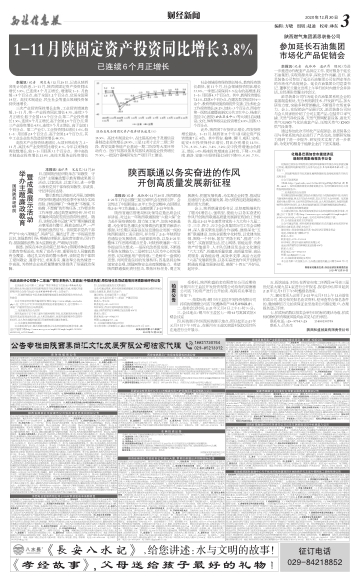 1-11月陕固定资产投资同比增长3.8%
