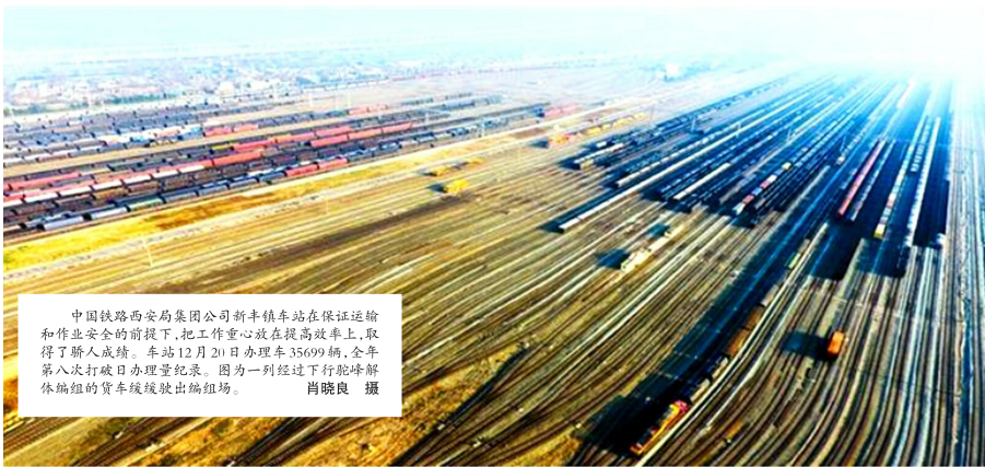 中国铁路西安局集团公司新丰镇车站在保证运输和作业安全的前提下,把工作重心放在提高效率上,取得了骄人成绩。车站12月20日办理车35699辆,全年第八次打破日办理量纪录。图为一列经过下行驼峰解体编组的货车缓缓驶出编组场。肖晓良 摄