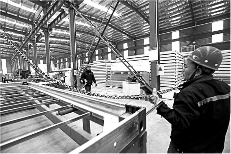 富阎新区中建集成房屋(西北)生产基地,是集成房屋、箱式房、模块房的专业生产厂家和供应商,2020年产量2000多台(套),产值4000多万元。图为工人在反转集装箱底部。肖晓良 摄