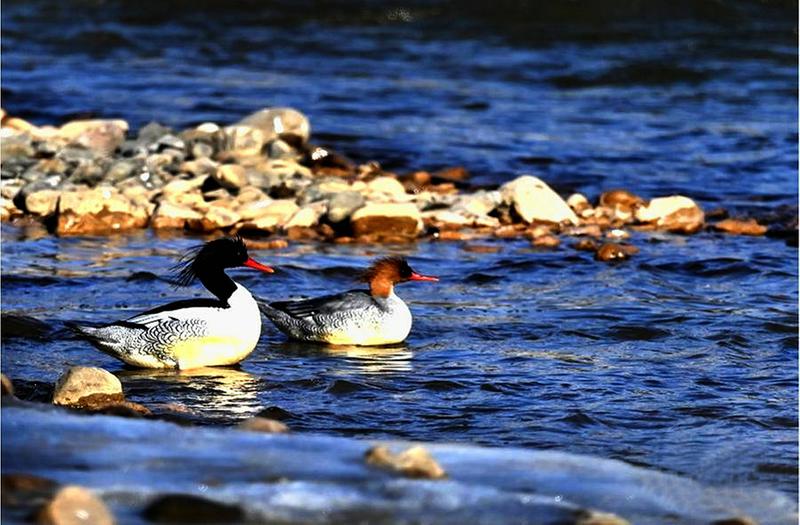 近日,在秦岭深处的陕西省商洛市洛南县洛河流域出现国家一级保护动物中华秋沙鸭种群。它们在洛河中觅食嬉戏,怡然自得。图为两只中华秋沙鸭在洛南县洛河城关街道段河滩小憩。陶明 摄