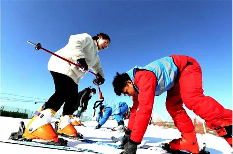 白鹿原影视城冰雪欢乐谷占地2.5万平方米,滑雪场所有场地布局均按国际滑雪场标准设计,主雪道长300米、宽60米。图为教练员在辅导滑雪爱好者滑雪。肖晓良 摄