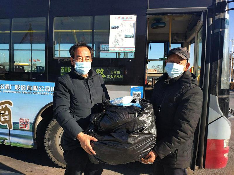 1月7日上午,芹河镇水掌村老党员贾罗明老先生再次带着自费购买的2400个口罩来到王家楼公交场站,希望给更多的公交车投放“爱心口罩”,帮助有需要的乘客。