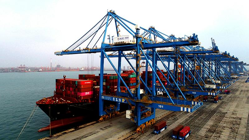 海关总署1月14日发布数据,2020年我国货物贸易进出口总值32.16万亿元,同比增长1.9%,在新冠肺炎疫情和单边主义保护主义等多重压力之下创历史新高。图为山东港口青岛港全自动化码头,一艘货轮在装载出口的货物。张进刚 摄