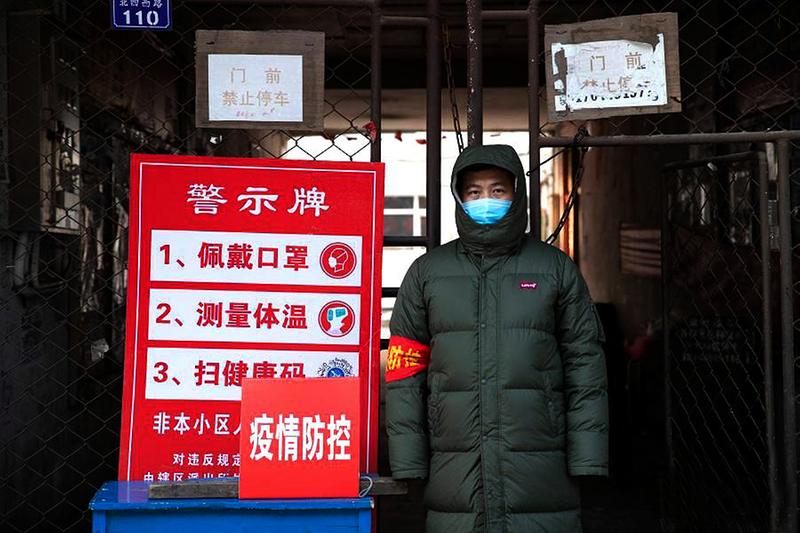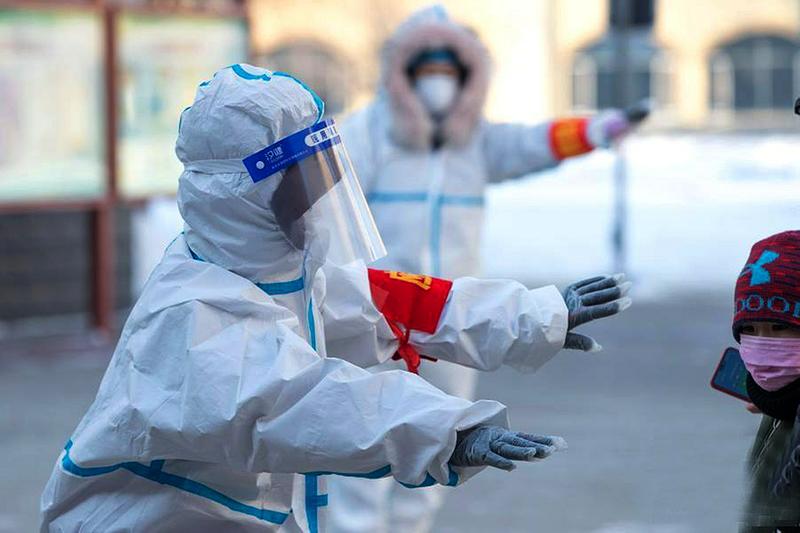 1月16日,在绥化市尚志小学家属楼小区卡点,工作人员在执勤。张涛 摄