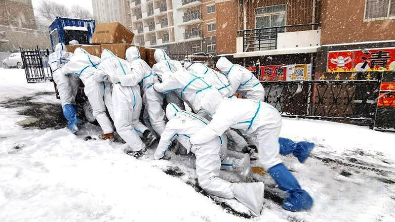 1月6日,大连海洋大学的志愿者们推着满载的三轮车上坡,将物资送到学生宿舍。大连海洋大学供图
