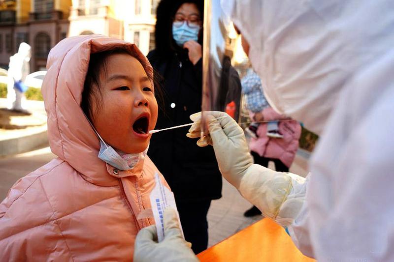 1月16日,在绥化市尚志小学核酸检测点,工作人员在户外维持秩序。张涛 摄