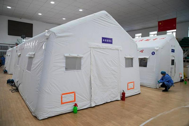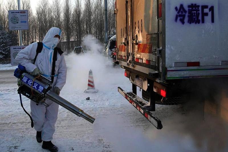 1月17日,工作人员在望奎县移动方舱检测实验室外进行消杀作业。张涛 摄