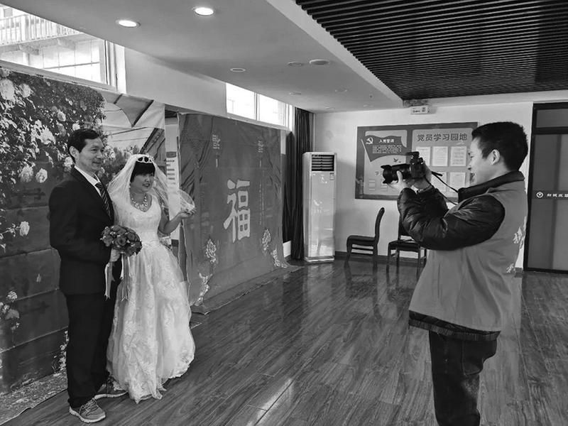 “叔叔,再靠近阿姨一点,阿姨您看镜头,笑一笑!”在西安市新城区解放门街道退役军人服务站会议室里,一片欢声笑语。在摄影师的指导下,现场的退役军人手挽爱人,脸上洋溢着幸福的笑容。近日,西安市新城区退役军人事务局联合中国人像摄影家协会的志愿者们,共同开展“情暖夕阳,关爱退役军人”免费拍摄婚纱活动,为辖区9个街道200多名退役军人送上一份特别的新年礼物。拍摄活动结束后,还为参与的退役军人赠送7寸照片3张和24寸放大娟丝挂轴一副,为老兵送上新年的祝福。图为免费拍摄婚纱现场。