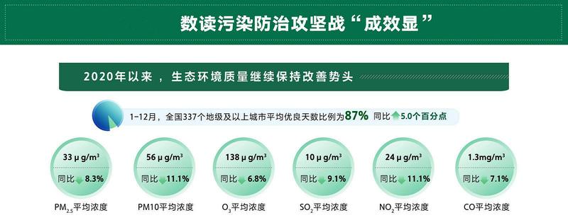 2020年,生态环境质量继续保持改善势头。1—12月,全国337个地级及以上城市平均优良天数比例为87.0%,同比上升5.0个百分点;1940个国家地表水考核断面中,水质优良(Ⅰ~Ⅲ类)断面比例为83.4%,同比上升8.5个百分点;劣Ⅴ类断面比例为0.6%,同比下降2.8个百分点;PM2.5平均浓度为33微克/立方米,同比下降8.3%……为了坚决打赢打好污染防治攻坚战,坚持方向不变、力度不减,突出精准治污、科学治污、依法治污,污染防治攻坚战有力有序推进。