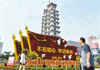 游客在郑州二七纪念塔前(2019年10月2日摄)李嘉南 摄 “东方红,太阳升……”悠扬的《东方红》乐曲结束,整点的钟声从矗立在郑州的一座独特的连体仿古双塔塔顶传来,回响在周围鳞次栉比的高楼大厦之中。与这些高楼相比,这座高63米的塔似乎不够“魁梧”,与郑州悠久的历史相比,这座塔又显得非常年轻,但它却是郑州的地标性建筑,也是郑州人的精神之塔,这就是——郑州二七纪念塔。