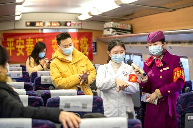 1月25日,成都铁路局重庆疾病预防控制所工作人员(右二)在列车上为旅客示范“七步洗手法”。