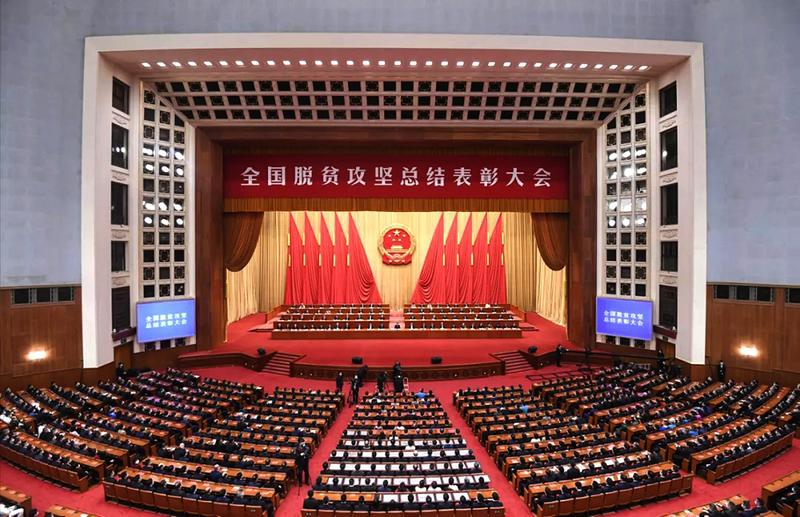 人民大会堂大礼堂,气氛隆重热烈。主席台上方悬挂着“全国脱贫攻坚总结表彰大会”会标,后幕正中是熠熠生辉的中华人民共和国国徽,10面红旗分列两侧。二楼眺台悬挂标语:“紧密团结在以习近平同志为核心的党中央周围,全面推进乡村振兴,巩固拓展脱贫攻坚成果,为全面建设社会主义现代化国家、实现中华民族伟大复兴的中国梦而团结奋斗!”