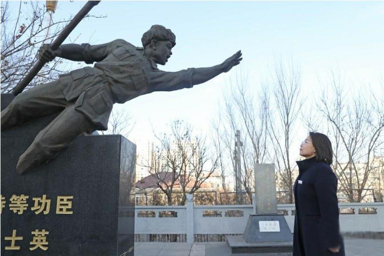 2月2日,梁士英烈士的孙女梁丹丹在梁士英舍身炸地堡遗址瞻仰爷爷雕像。杨青摄 在辽宁锦州市区西北,有一座公铁立交桥——士英桥,桥边的路基上就是著名的梁士英炸地堡遗址。