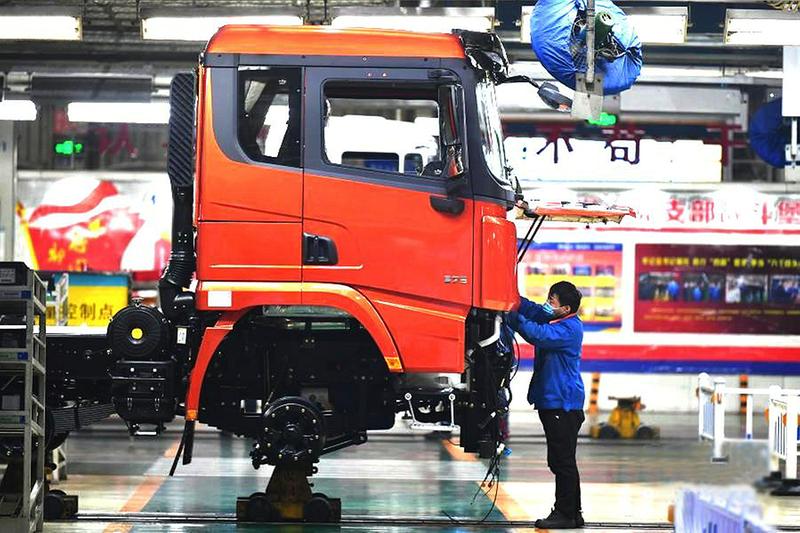 近年来,陕西汽车控股集团有限公司坚持以创新引领发展,积极构建跨学科、跨领域的产学研创新平台,加快清洁能源、智能网联、自动驾驶等技术研究,企业的新模式、新业态、新技术、新产品不断丰富。2020年,陕汽集团全年销售汽车23.5万辆,实现工业总产值1039亿元。图为工人在重卡总装线上作业。