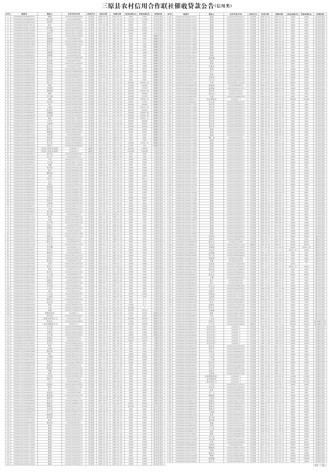三原县农村信用合作联社催收贷款公告(信用类)