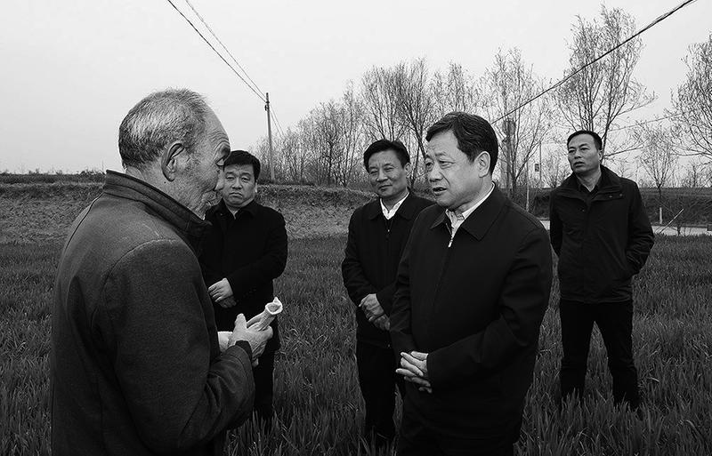 3月17日,铜川市委书记樊维斌到铜川市耀州区调研春季农业生产工作。他强调,要认真贯彻落实中央农村工作会议精神和全国两会精神,抢抓农时精细管理,夯实增产丰收基础。图为在关庄镇麦田和农民亲切交谈。