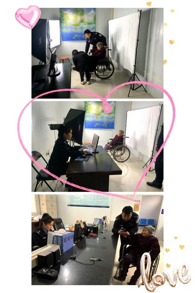 因老人身体原因,照片采集工作并不顺利,户籍民警耐心指导,多次帮助老人矫正坐姿并细心的为老人整理着装,成功为其采集了人像信息;因指纹磨损严重,民警又耐心的多次尝试,最终完成指纹采集工作,顺利为老人办理了身份证,民警又将老人的轮椅推至门口,目送老人离开。
