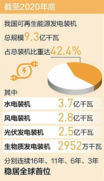 数据显示,截至2020年底,我国水电装机3.7亿千瓦、风电装机2.8亿千瓦、光伏发电装机2.5亿千瓦、生物质发电装机2952万千瓦,分别连续16年、11年、6年和3年稳居全球首位。目前,我国已形成较为完备的可再生能源技术产业体系。水电领域具备全球最大的百万千瓦水轮机组自主设计制造能力。低风速风电技术位居世界前列,国内风电装机90%以上采用国产风机。