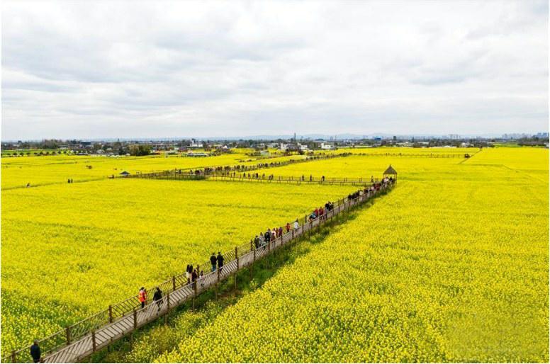 ▶2月28日拍摄的四川省广汉市高坪镇成片的油菜花(无人机照片)。江宏景摄 四川省德阳市广汉市是我国农村改革发源地之一。
