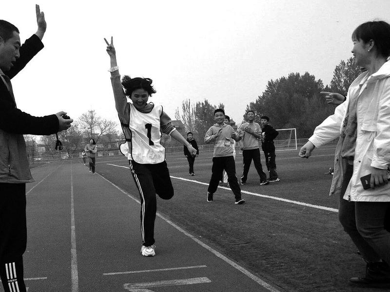 4月7日,西安市高桥中学“光彩浪花‘水文化’艺术节”上,在800米中长跑项目中获得优胜的张思涵同学高兴地比起了手势。