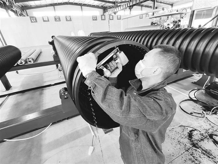 珑邦管材生产线是长武县招商引资的重点项目之一,总投资1.5亿元,主要从事HDPE、PVC排水管及其配件的研发、生产和销售,可解决当地富余劳动力200多人就业,带动该行业相关上下游产业发展,实现较好的经济效益和社会效益。图为工作人员正在作业。