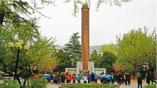 师生们在宝天铁路烈士纪念碑前缅怀英烈。 宝天铁路是陇海铁路大动脉的重要组成部分。清明节,冒雨前往宝天铁路英烈纪念馆缅怀先烈的群众络绎不绝。伴着庄严雄壮的国歌声,人们的思绪仿佛穿越清冷的雨滴回到71年前中国人民解放军劈山凿石、战天斗地修建铁路的那段艰辛岁月。
