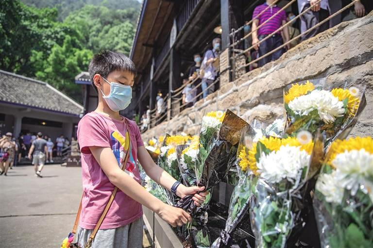 5月1日,在重庆渣滓洞看守所旧址景区,一名游客为烈士献花。当日是“五一”小长假第一天,重庆红岩文化景区迎来红色旅游高峰,众多游客来到渣滓洞看守所旧址参观游览,缅怀革命先烈,接受爱国主义教育。