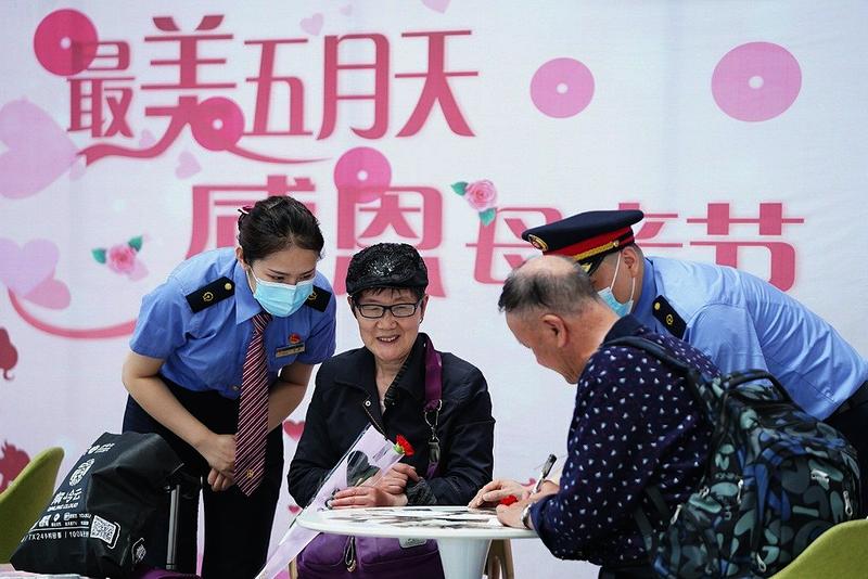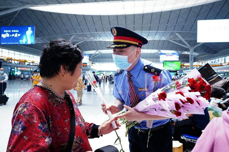 5月9日,西安北站候车室母婴关爱重点服务区鲜花簇拥,在此候车的有抱着孩子年轻的母亲、有独自出行年迈的母亲、还有即将要迎接小生命的母亲,一支支递到母亲手中的康乃馨,用“母亲,我爱你”的花语向她们表达着节日的祝福。
