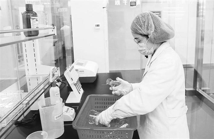位于咸阳市新兴纺织工业园区中小企业孵化基地的尤爱倍特乳业生产项目投资五点零四亿元,分两期建设调制羊乳粉生产线。目前,已经建成投产项目一期的三条调制乳粉生产线和质量安全检测实验室等配套设施,可提供就业岗位二百多个。图为工作人员正在进行质检。