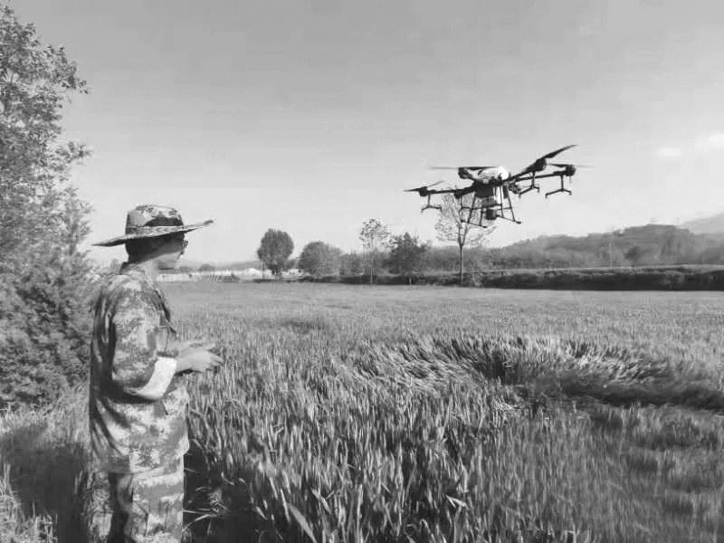 5月10日,一架“飞机”正在陇县固关镇固关街村麦田上空来回穿梭,农技人员遥控指挥“飞机”喷洒农药。