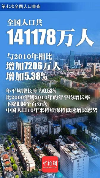 据国务院第七次全国人口普查领导小组副组长、国家统计局局长宁吉喆介绍,全国人口共141178万人,与2010年第六次全国人口普查数据相比,增加7206万人,增长5.38%,年平均增长率为0.53%,比2000年到2010年的年平均增长率0.57%下降0.04个百分点。数据表明,我国人口10年来继续保持低速增长态势。