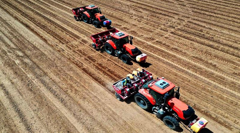 眼下正值播种的关键时期,在定边县堆子梁镇种羊场村的马铃薯高产示范田里,北大荒马铃薯集团的脱毒种薯正在有序播种,这些从黑龙江而来的马铃薯脱毒种薯,经过了晒种、催芽、切块,再与草木灰搅拌装进农机播种到田地里,就成为了农民眼里增收致富的“金豆豆”。