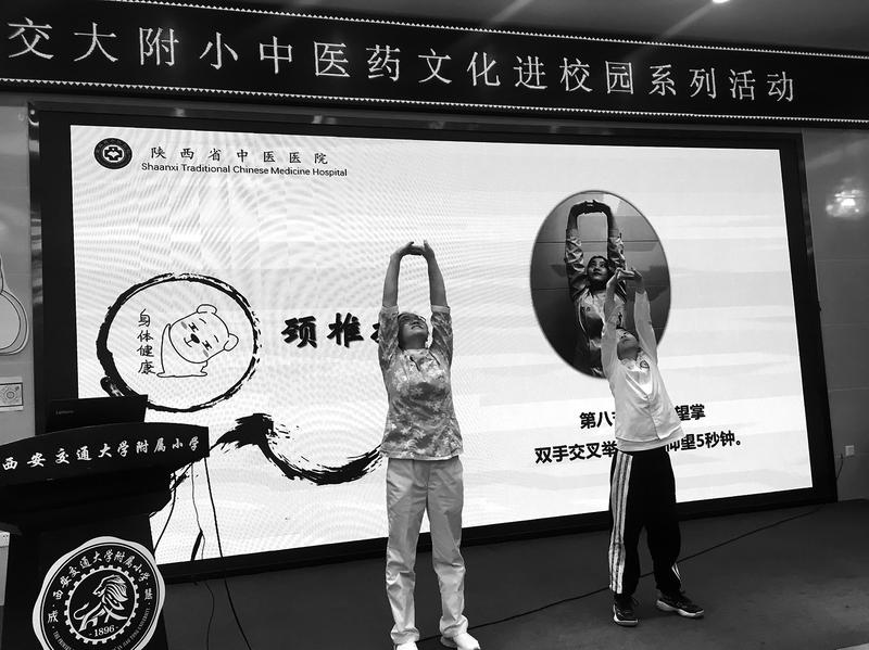 近日,陕西省中研院省中医医院“中医药文化进校园”第13期活动在西安交通大学附属小学如期进行。骨伤二病区王恋护士为同学们作了题为《强筋骨健体魄,一起来做颈椎操》的讲座。