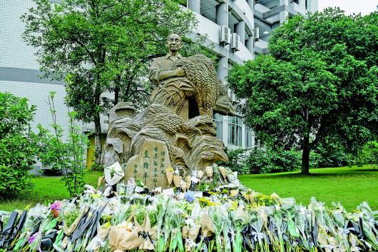 人潮中,有许多手持鲜花、从四面八方赶来的莘莘学子。他们面庞青涩,神情肃穆,安静有序地跟着队伍一步步前移,然后,深深鞠躬。