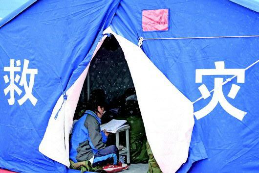 震后天空下起了雪,雪花飘舞,寒风凛冽,气温低至零下8摄氏度。学生们在帐篷里盖着厚实的毛毯,并陆续安装起炉子取暖。下午3时30分左右,前来救援的消防人员冒着余震危险,从教学楼里把学生们的书本抱到帐篷里。