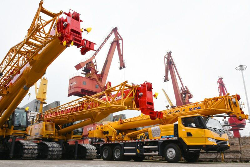 5月31日,一批工程机械设备在江苏连云港港口码头集结等待装船出口。