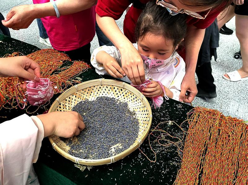 参与香囊DIY制作的王心女士一边将香囊挂在女儿的身上一边说:“我还是小时候跟着奶奶做过一次香囊,这次活动勾起了满满的回忆,能在候车的时候感受传统文化,非常赞。”