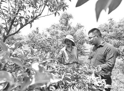 在四川彭山区公义镇,刘沈厅(右)到家庭农场主郑利彬的果园查看交流晚熟柑橘的长势情况。2016年底,从电子科技大学电子科学与技术专业硕士毕业后,刘沈厅放弃公派留学和留校的机会,回到家乡创办家庭农场,和父亲一起创业。 凌晨2点,某网络平台助农专场直播间内仍灯火通明,镜头前的安秋金一身标志性打扮:齐眉刘海、黑墨镜,亮眼的橙色围裙系在宽松黑衫外。此时,这个24岁的小伙子已直播10余个小时,但在与果农的现场连麦中还是妙语频出,毫无倦意。