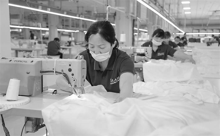 陕西雅兰布草绿色智能制造项目总投资3亿元,一期计划投资1.5亿元,目前项目已完成设备的安装调试,并进行部分试运行和生产。图为生产车间一角。
