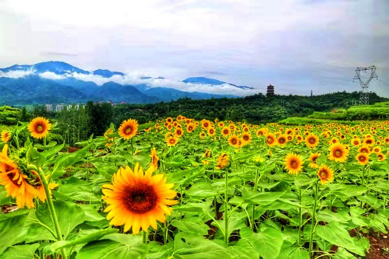 在有着汉阴“后花园”美誉的城关镇麒麟村的向日葵产业园里,各色品种的向日葵花争相开放,一片金色花海在夏日微风的吹拂下,绵延起伏推向龙岗阁山脚下,美景绚丽壮观,吸引众多游客来此打卡赏花,流连忘返。