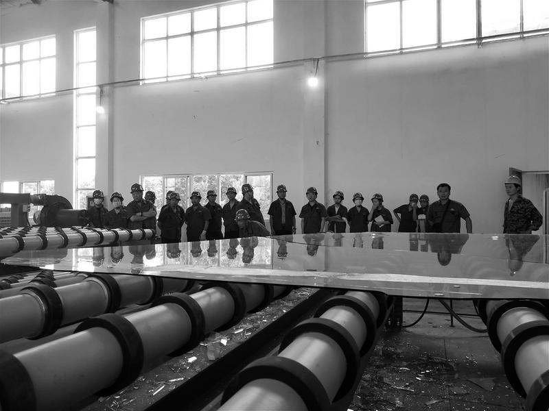 7月27日上午9点58分,随着一声令下,熔窑流道闸板徐徐升起,通红的玻璃液从熔窑缓缓流向锡槽,操作员工手持工具,精心平稳地将玻璃带引过锡槽,并顺利引导上过渡辊台缓缓进入退火窑。经过半个小时退火降温,带着余热的首片玻璃板头从退火窑中缓缓而出,进入冷端输送辊道,一条闪亮的玻璃带着余温呈现在辊道上,至此中玻(陕西)新技术有限公司400T/D汽车及功能玻璃基片成功下线,标志着中玻陕西基地400T/D汽车及功能玻璃正式进入生产运营阶段。