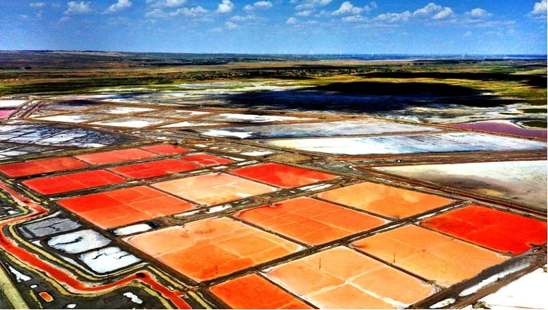 榆林市定边县是陕西省的湖盐产区,盐湖群主要分布在一条西南至东北走向的弧线低洼地带。每年的夏秋时节,湖中不同的矿物成分和藻类,让盐田在高温和光线的共同作用下呈现出五彩斑斓的颜色,仿佛铺陈在大地上的调色板。