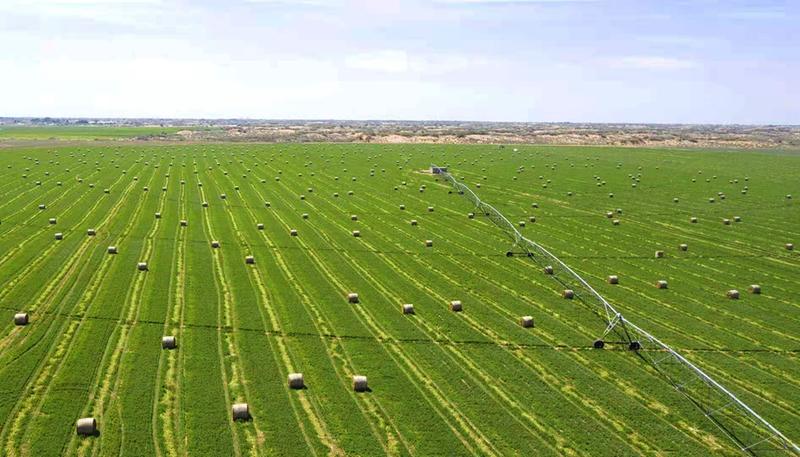 经过晾晒、聚拢、打捆的苜蓿草,成为畜牧养殖的最佳饲料,被运送到全区乃至周边省份的各大养殖场,其中包括全国最大的单体湖羊养殖场——榆阳区上河集团常乐堡15万只湖羊养殖基地。