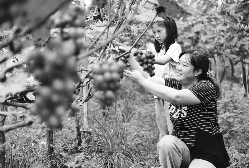 宁强县汉源街道办事处石墙院村村民朱桂英和小女儿在自家葡萄园里察看葡萄长势。赵永跃、朱桂英夫妇流转土地80余亩发展大棚蔬菜、莲藕、葡萄等,当地30余户群众通过土地流转和入园务工,户均增收5000元以上。