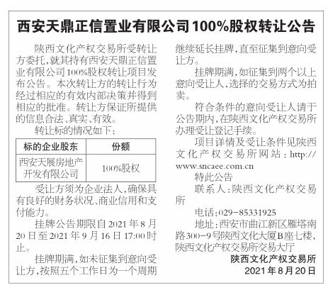 西安天鼎正信置业有限公司100%股权转让公告