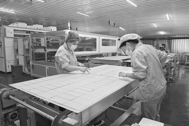 近日,在澄城县陕西拓日新能源科技有限公司,工人在晶体硅组件车间有序生产。