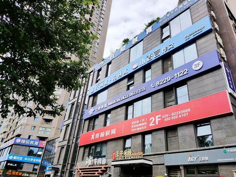 沿着兴庆路往东走,马路两旁的写字楼上满是各家教育机构的宣传标语。学府首座写字楼A座里面从1层到5层均为教育培训机构。2楼的“京翰教育”大门紧锁,记者能透过门缝看到里面有几个工作人员在打扫卫生。3层的“弋果美语”、4层的“虾语文”和5层的“行知教育”都已经是人去楼空。
