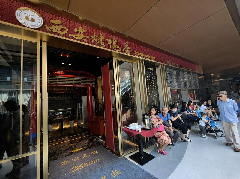 “西安烤鸭就是我们一家人聚餐的首选” 二楼的西安烤鸭店是家人聚餐的首选。说起烤鸭,大家往往都知道北京烤鸭,殊不知西安烤鸭店始创于1916年,是我们西北第一家烤鸭专营店。还没到饭点,店门外的椅子上已经坐满了排队的食客。橱窗里,刚刚出炉的鸭子整整齐齐挂了一排,金黄的表皮看得人垂涎欲滴。