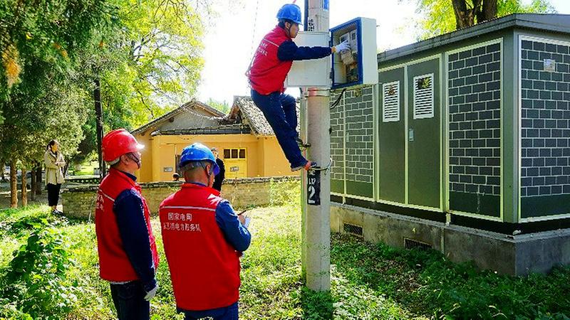 国网陕西张思德(延安枣园)共产党员服务队队员为枣园旧址检查线路。
